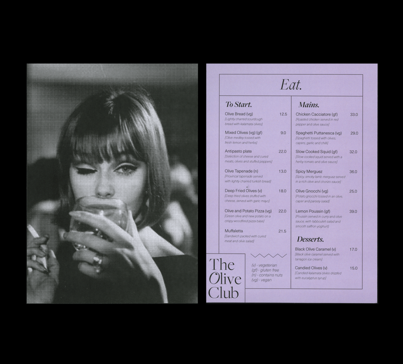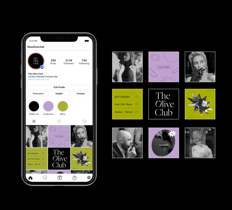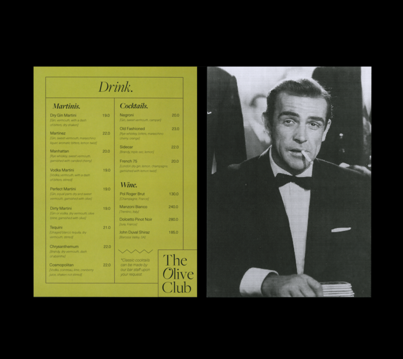 The Olive Club is a London Based Martini Bar solely dedicated to serving food and drinks made from or with olives. The branding and collateral was made to reflect the classy and luxurious feel of the venue, with an ode to elegance and exclusivity. It's identity references an old fashioned, high society era, presented in a contemporary and upbeat style.